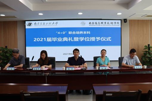 6月22日下午,南京信息工程大学与南京信息职业技术学院联合培养的2021届4+0本科毕业生毕业典礼暨学位授予仪式在南京信息职业技术学院行政楼C403会议室隆重举行。南京信息工程大学应用技术学院院长张军、副院长孙薇、学办主任李俊平,南京信息职业技术学院教务处处长杨前华、电子信息学院党总支书记王正、副院长张志友、分团委书记李依诺、任课教师、辅导员和全体毕业生参加了典礼。南京信息职业技术学院电子信息学院分团委书记李依诺主持仪式。