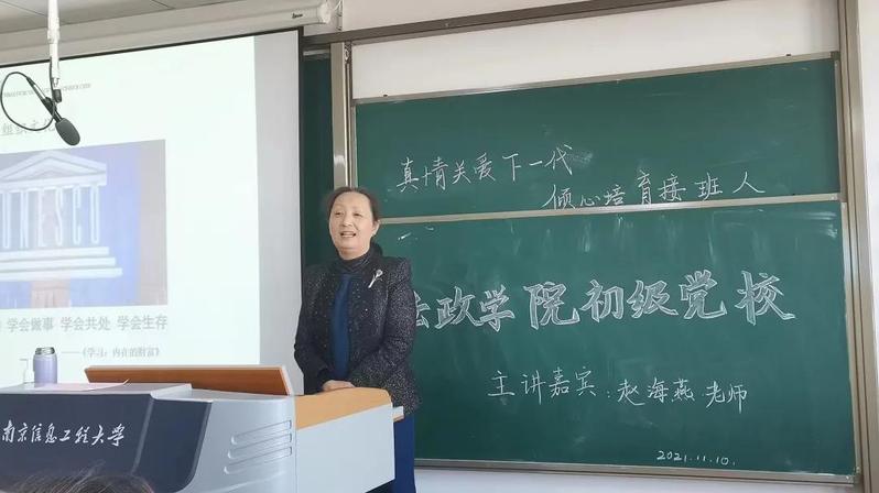 11月10日下午,法政学院在阅江楼639室举办以“真情关爱下一代,倾心培育接班人”为题的第二次党课。本次党课由学院关工委常务副主任、特邀组织员赵海燕老师主讲,法政学院2021级全体学生听课,党课由学院副书记朱文镇老师主持。