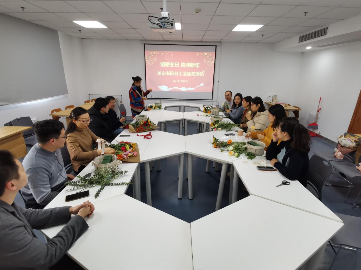 为丰富教职工业余文化生活,提升生活品味,陶冶情操,增进友谊,龙山书院分工会于12月31日下午在尚贤楼302举办“情暖冬日,喜迎新年”主题插花活动,书院全体教职工参加活动。