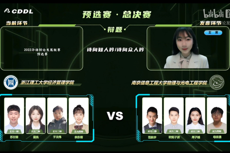 预选赛决赛采取线上形式举行,决赛辩题为“诗向知人吟/诗向众人吟”。物电院辩论队持“诗向众人吟”的反方立场。赛前,物电院辩论队积极准备,辩论队队长母宗湧、总教练欧阳子澍、最佳辩手范航宇及雷丁学院辩论队队长周子越等强强组队。