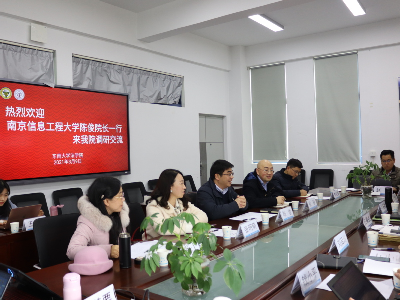 陈俊向东南大学法学院师生介绍了学院的基本情况与学科特色。他认为,南京信息工程大学和东南大学都是理工科为优势的学校,东南大学法学院能提早布局,系统谋划,为新文科建设提供了有益思路和宝贵经验,很多制度和做法值得深入学习。此次考察调研收获满满,对学院“十四五规划”和学科发展极有裨益。