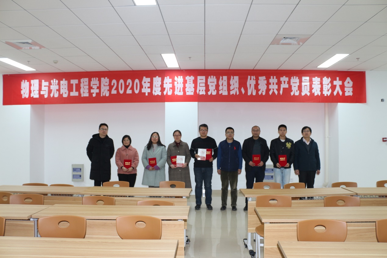 大会在庄严的《国歌》声中开幕。田智宣读了《物理与光电工程学院关于表彰2020年度先进基层党组织、优秀共产党员的决定》,授予光电工程系教工党支部、物理系教工党支部2个支部“先进基层党组织”,授予陈宣、陈云云、王俊峰、杨翠红、赵静、周庚侠6位同志“教工优秀共产党员”称号,授予陈帅东,林婷2位同志“优秀学生共产党员”称号。随后获奖支部和优秀党员代表依次上台发言,分享了自己在工作、学习、生活中取得的成绩与获得的经验,充分展现了基层优秀共产党员的风采,并号召全体师生党员团结一心,为学院建设、学校发展贡献自己的力量。学院领导为受表彰的同志颁发证书并赠送《从13人到9000多万人——史上最牛创业团队》和路遥的《人生》两本富有教育意义的书籍。