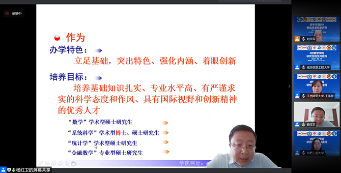 为不断提升硕士研究生招生宣传力度,深入挖掘优秀生源,近日,由我校数学与统计学院牵头,联合山东科技大学数学与系统科学学院、合肥工业大学数学学院、安徽大学数学科学学院、河南师范大学数学与信息科学学院、江西师范大学数学与统计学院、曲阜师范大学数学科学学院、宁波大学数学与统计学院七所拥有数学博士点的学院开展了线上研究生招生宣讲会。数统院院长张建伟、院党委书记贾冰、副书记徐锋华、副院长曹春正、院长助理方金辉,以及七所高校数学学院负责人出席会议,八校共千余名学生通过线上线下方式听取了宣讲会议由数统院副院长刘文军主持。