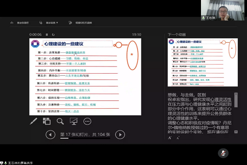 王老师首先为大家介绍了何为心理健康,并强调了心理健康对个体的重要性。他从“人、情、事、理”四个维度入手详细阐释了心理健康的概念。随后,王老师重点为大家介绍了舒缓压力的方式,从认知层面如何看待压力,到情感层面如何调节情绪,再到行为层面如何采用行之有效的办法去释放压力,王老师的讲解风趣幽默,为同学们提供了实操性强的应对方法。