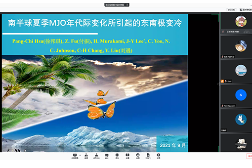 最后付振同学的报告《East Antarctic cooling induced by decadal changes in Madden Julian Oscillation during austral summer》,在理论上探讨全球变暖下东南极出现了变冷现象的原因,并从简化的地球系统模型上验证了最终机理。随后参会同学和付振线上进行了专业而深入的探讨。