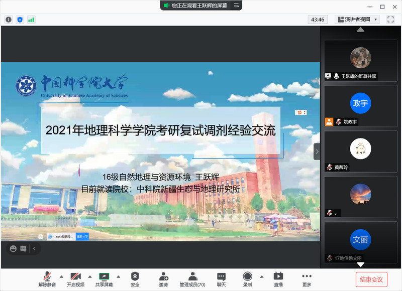 2021年3月20日晚,地理科学学院举办了2021届考研复试及调剂经验线上交流会,会议邀请了多位我院16级考取研究生的毕业生学长进行经验分享并为考研的同学们进行答疑解惑,会议由学院学办主任张莹瑞老师主持,17级全体考研同学参加。