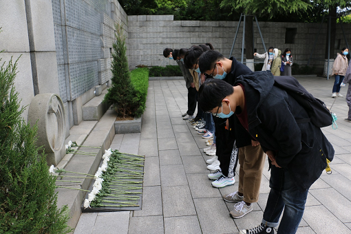 同学们首先进入纪念馆进行参观,馆内“历史证人的脚印”铜版路上,铸有南京大屠杀幸存者脚印、中国当年参与远东国际军事法庭审判的成员脚印。铜版路上两位已故幸存者的雕塑,铭刻着这段泣血的历史。许多同学驻足在幸存者名册纪念墙前,看着随时间的推移,一张张照片慢慢失去色彩,消隐在历史中,心情无比沉重。无数双眼睛见证了这场历史浩劫,无数条生命消隐在那夜冷雨,然而仍存在冥顽不化的人否认这段历史。当幸存者一个个老去,一位位见证者逐渐无法再站上审判的法庭,我们只有以民族复兴为己任,为中华民族真正屹立在世界之林而奋斗,以大国之姿彰显正义,让那些企图歪曲历史的人无处遁形!