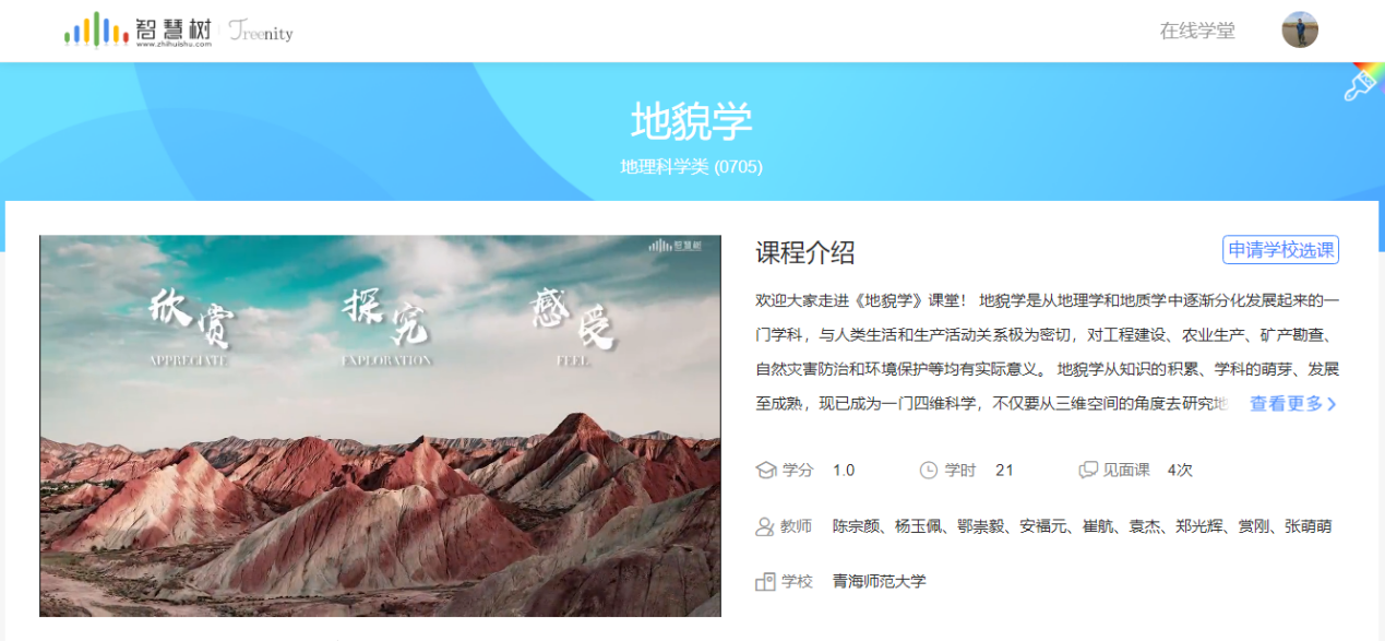 根据“青海-江苏省际合作”及《南京信息工程大学-青海师范大学战略合作协议》,经过双方教师的共同建设,《地貌学》慕课近期在“智慧树”上线,为地理类学生的学习提供了新的教学资源,在近期疫情期间青海师大的课程教学中发挥了重要作用。课程的上线成为两校合作的又一成功典范。我校地理科学学院赏刚老师、郑光辉老师及张萌萌老师参与了课程规划与建设,承担海岸地貌及河口地貌的教学内容。