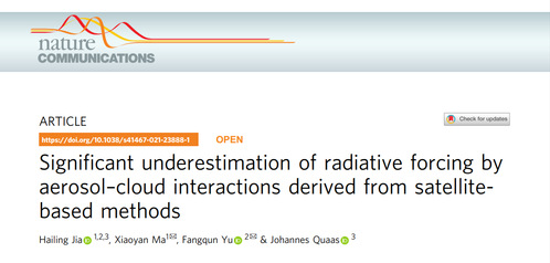 论文资讯及链接:Jia, H., Ma, X., Yu, F. et al. Significant underestimation of radiative forcing by aerosol–cloud interactions derived from satellite-based methods. Nat Commun 12, 3649 (2021). https://doi.org/10.1038/s41467-021-23888-1。