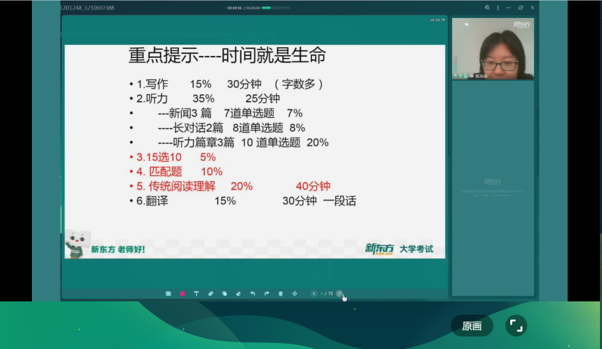 9月29日下午,新东方四六级考试辅导专家黄雅屏线上开讲“英语四级开学抢跑第一讲”。黄雅屏介绍了大学英语四级考试的题型设置、详细时间点、考生操作内容以及考生须知等,有针对性地为新生们指明了应对四级的考试策略,详细地讲解了时间分配和各种类型题目的做题技巧。