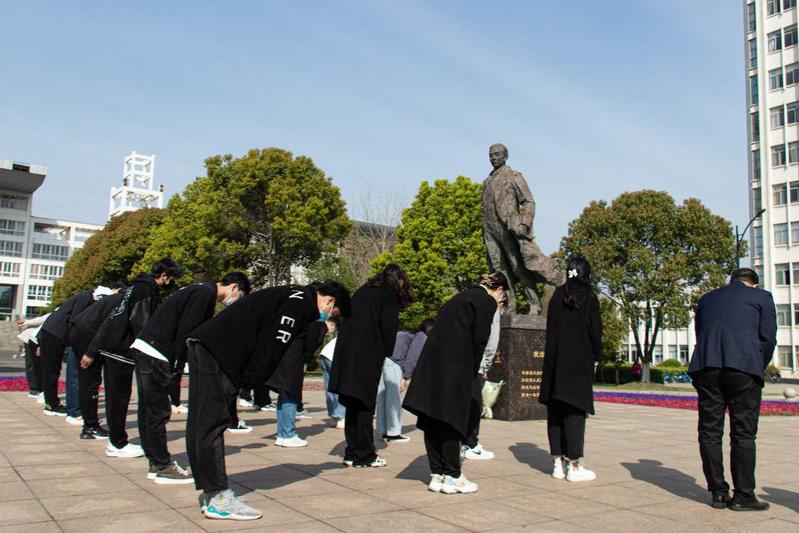 4日清晨,支部组织党员代表和入党积极分子代表,在气象楼涂长望雕像前进行祭扫,深切缅怀涂长望先生,以追忆先生对中国气象事业做出的杰出贡献,领悟长望精神。祭扫活动开始,由金费缘同学作为党员代表发言,表达对长望先生的追念之意,以及作为长望学子,励志与先人一般,奋发图强,成为国之重器,不负先生所托的决心。随后,由院党委副书记王康宏讲话,他在涂长望雕塑旁向大家介绍了先生的生平事迹,及其在中国气象领域的杰出成果和巨大贡献。在讲到先生晚年双目不能聚焦,坚持口述写下《关于二十世纪气候变暖问题》这一重要论文时,他的语气中流露出对先生精神境界和责任担当的敬佩,这份深沉的感情也感染了在场的每一位同学。同时,王康宏副书记也号召我们党员同学要铭记并传承长望精神,要有家国情怀,要为中华民族伟大复兴的中国梦奋斗不息!随后,两名党员代表向涂长望雕塑敬献鲜花,完毕之后全体面朝雕像鞠躬行礼,以表对长望先生的哀思和怀念。