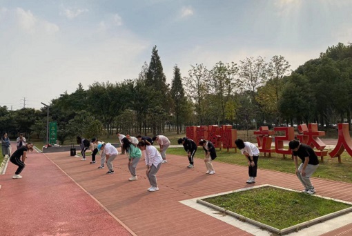 大气院辅导员老师何培作为带教老师参加了此次活动。何培老师主修运动人体科学专业和体育人文社会学专业,具有较为丰富的运动经验。在秋日和煦明媚的阳光下,何老师首先和大家一起进行了准备活动,用以放松肌肉、避免运动损伤。随后,大家在舒缓的音乐中学习了一支简单的律动体操,放松身体和神经。同学们也从开始的紧张拘泥慢慢变得放松自然,活动中时时传来大家愉快的笑声。