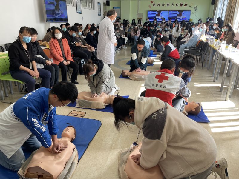 高新医院急诊科主任李现雷首先从人类心脏构造与工作原理的角度深入浅出地讲解了急救原理。他以“抓住黄金四分钟,托住生命的重量”这句话来形容及时抢救的重要性。随后,叶晓东老师为我们介绍心脏复苏术。他结合教学视频为大家详细解说心肺复苏的步骤和要领,该如何拨打求救电话、如何向周围人请求援助,如何判断患者状况,如何科学施救等。他还介绍了AED的功能以及使用方法,详细解释了一些注意事项以及如何寻找到AED机和AED机使用过后的处理方法,以及在气道异物阻梗时如何进行自救与互救等。他提醒师生们在自救或者互救之后也要及时拨打120就医检查。之后,培训会组织师生分批上前练习施救技能,随行的所有医护专家上场对他们进行一对一指导,对同学们施救不规范的地方进行纠正,整个过程氛围活跃、热情高涨。在南京红会指导下,师生们进行了积极踊跃的答题活动,对自己进行理论检测,并在各位医护专家的指导下通过了实践考试,成功领取到了CPR电子证书。