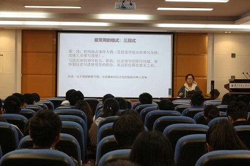 培训围绕新闻报道的含义、写法以及书写时的注意事项三个方面展开。活动伊始,谭贞通过提问互动的方式,结合同学们对新闻稿的现有理解进一步介绍其六大要素与主体结构,接着从格式上对新闻稿的书写提出了要求。在谈及注意事项时,谭贞以两篇新闻稿为例,细说了在人物职称、导语内容的书写和人称选用、描写的添加等方面易出现的错误,并给出了正确的写法示范。她同时强调,在书写新闻稿时,要立足于其简洁准确的特点,用精炼的语言传达新闻的主要内容。