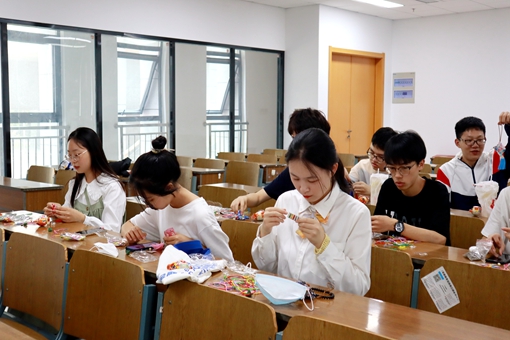 在活动现场,大家按照制作教程分工负责,有的填充香料,有的穿针引线,再加上皮绳、流苏、串珠,一个个立体饱满又精致的五彩香囊就完成了。针对香囊缝合问题,班级负责人还特别提醒,缝合关键在于针脚一定要密,线头和艾草就不容易露出来。走线一定要整齐,香包造型才能美观。除此之外,同学们还自发编织了盛放咸鸭蛋的蛋兜、用于驱虫祛湿的手链,并把这些小手工作为端午节礼物送给辅导员和班主任老师们。谈到“粽”享欢乐主题团日活动,2021级大数据管理与应用1班班长陈延毅说道,“我们希望通过做香囊、扎彩绳等方式为这个端午增添不一样的味道,让疫情防控下的校园生活更有乐趣,从而进一步提升班级的凝聚力”。