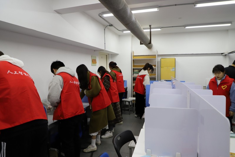 准备好祝福卡片后,学院的志愿者们来到了学院的考研教室。感受着上一届考研学子的激情余温,每一位志愿者经过短暂的分工环节,随后他们奋力投身于教室的打扫任务中,扫地拖地,整理桌面,清理垃圾,摆放考研祝福卡片。志愿者们一个个为即将考研的学子们提供优良的学习环境忙的不亦乐乎。所有工作在这群志愿者手中有条不紊地进行着,整个过程洋溢着欢声笑语,似乎忘记了疲惫。随着最后一袋垃圾被清除,他们望着焕然一新的教室,每个人都脸上都洋溢着灿烂的笑容,心中升起浓浓的自豪感,他们切实感受着雷锋精神带来的收获。
