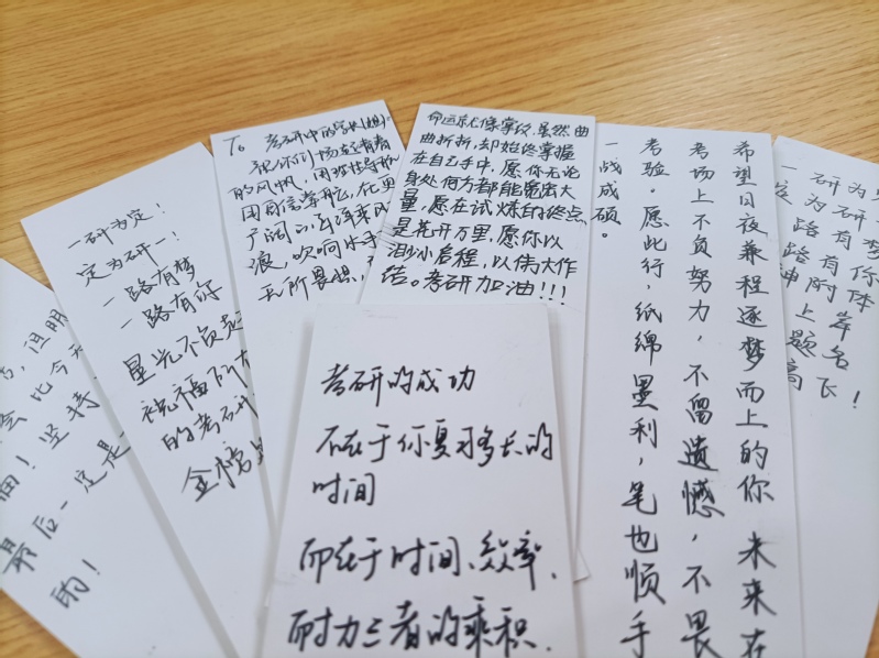 在领取纸笔之后,他们用一笔一划注入自己的心意,用一字一句表达对考研学长学姐的深深祝福。饱含深情的文字写在每一份精美的卡片之中,每个人都在相互分享着自己的祝福语,会议室里面弥漫着快乐的空气。随后,志愿者们拿着带有自己祝福的卡片,一起合影留念。