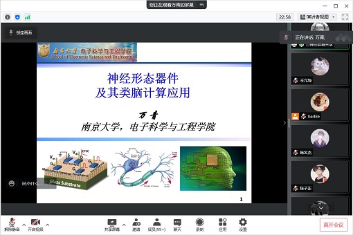 22日上午,南京大学万青教授受邀参与第二期“智荟高端论坛”,分享题为“神经形态器件及其类脑计算应用“的学术报告,会议由陈晓教授主持。万教授主要围绕四部分介绍神经形态器件及其类脑计算应用技术,分别为背景介绍、国内外研究进展、课题组代表成果、总结与展望。万教授首先开门见山介绍了开发灵感来源——人脑。他提出,研究人脑如何处理信息、研究其神经网络及学习法则,会对超低能耗智能计算和人工智能的未来有很大帮助。随后万教授介绍了国内外研究进展,回忆了留学时基于忆阻器的人造突触概念的提出,国内外皆掀起一波研究热潮。接着,万教授向大家展示了课题组代表成果,提出要用辩证思维看问题,材料本身固有的特性不分好坏,只看是否利用到极致.最后,万教授作出总结和对未来的展望,鼓励大家不断探索未知:”我做的只是底层基础层面的研究,其实还有很多未知需要探索,但我相信未来是光明的。“听讲的同学们都感受到了万教授严谨坚持的研究精神,在自己的学习与生涯发展方面都有了许多启迪。