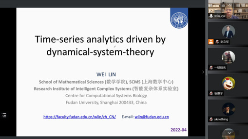 Existence and upper semicontinuity of time-dependent attractors for the non-autonomous nonlocal diffusion equations”。秦教授首先介绍了动力系统的一些概念,然后引出了吸引子的定义,并以非自治非局部扩散方程为例,证明了吸引子的存在性和上半连续性。王凤雨教授的报告题目为“Solving KPZ/Navier-Stokes Type Equations Using Distribution Dependent SDEs”。王教授利用分布依赖的随机微分方程(概率方法)来解决确定型KPZ/NS方程,推广了以前的结果,给出了解的存在唯一性。王健教授的报告“Exponential ergodicity of branching processes with immigration and competition”回顾了经典的遍历性理论,然后利用耦合方法首次给出了带有分支和竞争的分支过程的遍历性。陈昕副教授的报告题目为“Forward-backward stochastic differential equation on tensor fields and the application on NS equations on Riemannian manifolds”。他介绍了向前向后随机微分方程与拟线性偏微分方程之间的关系,把解的概率表示理论推广到了黎曼流形上,并给出了黎曼流形上的NS方程一个概率表示。林伟教授的报告“Time-series analytics driven by dynamical-system-theory”以动力系统为理论基础研究时间序列,引出了新的方法(Continuous Scaling)刻画了因果关系,利用重构的思想给出了短时间序列的预测并成功应用到了实际案例中。报告后,多位老师和同学对报告内容提出了问题,报告人给予了详细的解释。