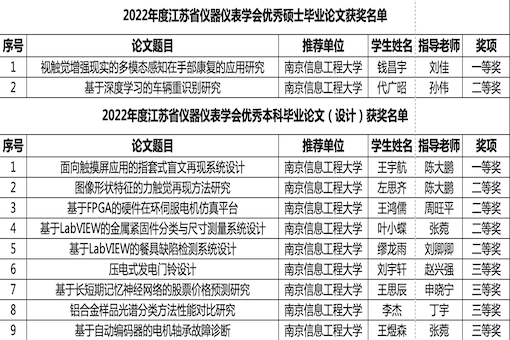 自动化学院在今年江苏省仪器仪表学会组织的“2022年度江苏省仪器仪表学会优秀本科/专科毕业论文(设计)”、“2022年江苏省仪器仪表学会优秀硕士毕业论文”评选活动中,喜获优秀硕士毕业论文2篇,其中一等奖1篇、二等奖1篇;优秀本科毕业论文9篇,其中一等奖1篇、二等奖4篇、三等奖4篇。