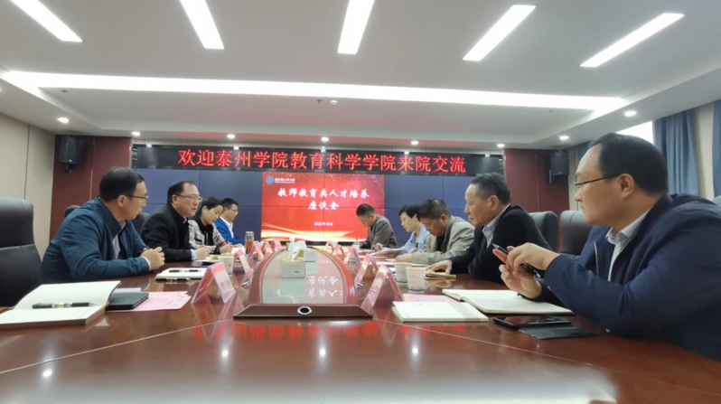 10月6日,泰州学院教务处处长潘小明,师范教育中心主任、教育科学学院党总支书记钱忠相,教育科学学院副院长(主持)刘华一行人来我校交流。我校教务处副处长郭雨、教师教育学院班子成员出席会议,会议由副院长刘玉柱主持。
