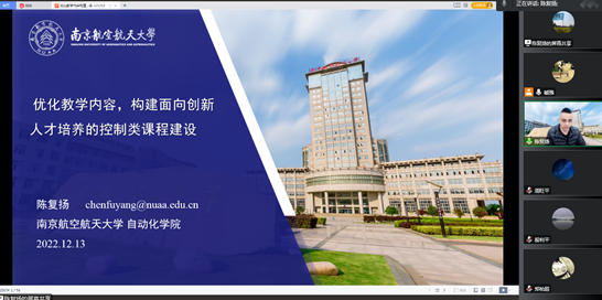 12月13日下午,自动化学院特邀南京航空航天大学自动化学院陈复扬教授做线上教学报告,报告题目为“优化教学内容,构建面向创新人才培养的控制类课程建设”。本次报告由自动化学院“自动控制原理“课程组长臧强副教授主持,副院长周旺平、院长助理郑柏超出席,自动化学院自动控制原理与现代控制理论等课程组教师参会聆听。