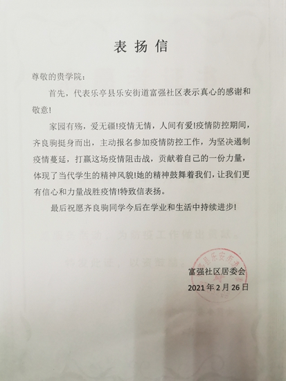 近日,水文院收到来自河北省乐亭县乐安街道富强社区的一封表扬信,表扬水文院齐良驹同学在寒假中“学做雷锋”,在河北省疫情反弹之际,逆风而上,让青春力量闪耀在防疫一线,用实际行动传承了雷锋精神。