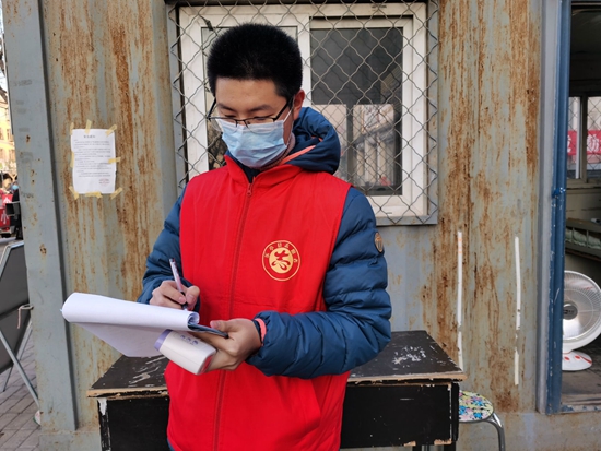 齐良驹同学寒假返乡后,了解到此次河北疫情出现反弹,社区防疫人手不足的情况后,主动到社区报到,成为了一名社区防疫志愿者。他每天与社区工作人员一道开展疫情防控工作,维护秩序、出入排查、测量体温,共同守护居民的安全。为尽快做好疫情排查工作,了解人员流动情况,齐良驹和其他志愿者们开展了“敲门行动”,不漏一户,不查一人。从大年二十九的晚上一直坚守到到年三十的凌晨,眼睛涩了就去洗把脸,肩膀酸了就自己捶捶,直到最后一条信息录入电脑,他才红着眼睛走出了居委会。第二天早上八点半,齐同学不顾一身的疲倦,又和往常一样,穿着志愿者红马甲准时出现在了小区门口。