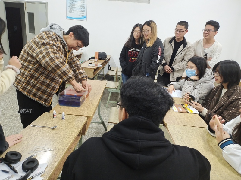 在接下来的实验环节,沈岳学长演示了一个有关锋面的实验。玻璃水箱模拟大气环境,随着其中隔板的移出,蓝水代表的冷气团和红水代表的暖气团在箱内交锋,色素迅速交织,形成了我们曾在课本中看过的冷暖气流交汇时形成的锋面现象,第一次近距离观察锋面现象的模拟,同学们凑在学长周围,发出阵阵惊叹。
