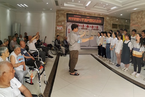 为老人宁静、单调的生活增添欢快喜悦的氛围,志愿者准备了丰富多彩的节目,表演从八位同学一起献上的舞蹈《酒醉的蝴蝶》拉开序幕,接着管琳同学演绎了吉他弹唱《兰花草》,两个节目过后,老人们渐渐融入到了现场欢乐的氛围中,在大合唱《我和我的祖国》之后,老人们仍意犹未尽,纷纷点歌,现场响起了阵阵热烈的掌声,氛围火热,同学们也一一满足了老人们的愿望,相继表演了《歌唱祖国》《黄河大合唱》《打靶归来》等歌曲,最后在小合唱中宣告结束,精美的舞蹈、嘹亮的歌声将浓浓的敬老爱老之情沁入老人的心田。