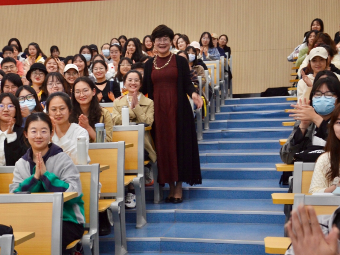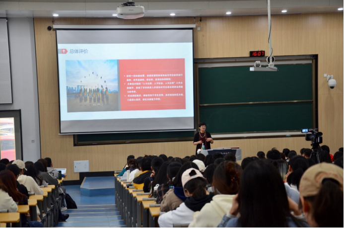 讲座中,朱俊应从新高考英语谈起,结合自身职业生涯,围绕新高考最新动向、英语师范专业的学习和规划、新入职教师的共性问题、师范生说课微课面试策略几个方面展开介绍。她提醒同学们在教师专业成长过程中要时刻关注“党、时、己”,在教育教学改革中要充分体现“融、放、稳”的理念;强调要让学习在教学中真正发生,让学生的必备品格和关键能力落地生根;建议同学们要想成为一名优秀的专业教师必须做好职业规划,在学习和规划中不断提升专业素养和专业能力,从知识、能力和情感这三个维度不断完善自我,并提出学会反思、沟通合作、教学反哺、终身学习等有益策略。最后,朱校长深情回顾了自己三十余年的专业成长历程,勉励大家力争做一名幸福的人民教师,赢得了在座同学的阵阵掌声。