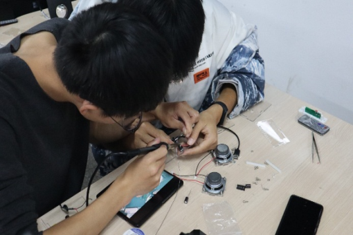 在两个多小时的不懈努力之下,大家成功制作出了一个个蓝牙音箱,并迫不及待的拿出手机打开蓝牙测试它的性能。一时间,实验室响起了阵阵音乐,大家欢快的讨论声此起彼伏。