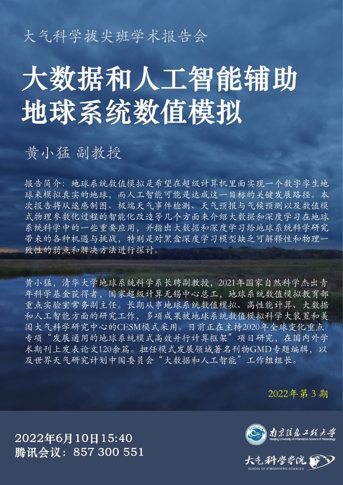 6月10日下午,大气科学专业拔尖班举行本学期第三期学术报告会,清华大学地球系统科学系黄小猛副教授受邀以“大数据和人工智能辅助地球系统数值模拟”为主题作报告,2020级、2021级大气科学拔尖班全体学生参加报告会,学术报告会由大气科学学院陈耀登副院长主持。