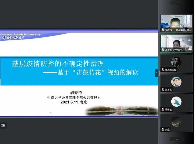 胡春艳教授作题为《基层疫情防控的不确定性治理——基于“击鼓传花”视角的解读》的学术报告。胡老师从基层疫情防控的不确定性、“击鼓传花”现象及后果、“击鼓传花”的生成缘由、如何避免“击鼓传花”这四个方面展开报告。首先,在基层疫情防控的不确定性方面,胡教授认为可将其具体分为疫情防控的复杂性、疫情防控的风险性和疫情防控的阶段性三个关键点,阐述了病毒的反复性导致了疫情防控任务具有艰巨性、基层组织责任同构互嵌性的增强、疫情下信息具有不完整性和模糊性,呼唤疫情防控责任共同体。其次,“击鼓传花”现象的表现分为:一是上层政府的任务“甩锅”体现治理重心下沉;二是基层政府的责任“接锅”体现基层承接能力。疫情防控中的击鼓传花一般是从上至下的单向传递过程,而不能反向传递。胡春艳教授着重强调“击鼓传花”的现象将会造成基层责任的堆积、政府的责任共同体面临解构、“责任型”的风险放大化。之后,胡教授分析了“击鼓传花”的生成原因:一是由于绩效考核压力的倒逼;二是因为官员自身能力的局限性;三是行政组织内部的权责结构失衡;四是行政组织内部风险问责制度的落后。其中最主要的原因是权责结构的失衡,在属地管理的背景下,职责同构导致层级之间分层不分工,基层组织受多头指挥,责任主体却变身为督察主体。最后,胡教授就如何避免“击鼓传花”现象发表了要完善泄压机制,加强官员治理能力,实现权责匹配,建立风险治理的复合问责制度的意见。