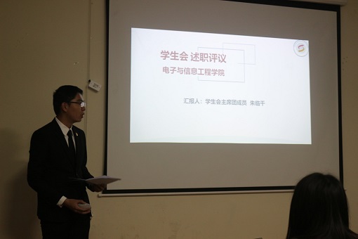 为规范学生会组织工作制度化、规范化,履行好组织工作职责,服务青年学生成长成才,4月8日晚,电子与信息工程学院于学科二号楼C110召开学生会干部述职述评会。团委书记金红、辅导员郑晓坤、王怡苏、高革飞出席,优秀学生代表们作为评委积极参会。会议由胡晨浩同学主持。