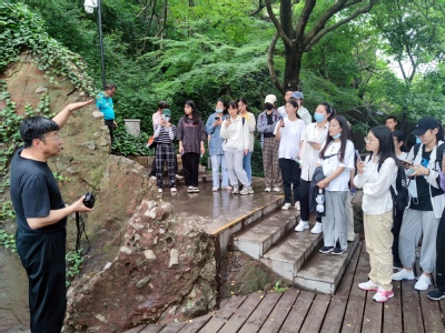 5月9日,同学们走进南京市的两所国家地质公园,近距离探索自然的奥秘。在方山国家地质公园,大家在火山口前观察火成岩的典型结构,目睹鹅卵石经工人开采加工成为建筑材料的神奇过程,赏老师引导同学们从颜色、矿物成分、结构与构造等方面对各类岩石进行细致观察。在六合国家地质公园,同学们重点学习了六棱石柱的特性,对空间布展、冷凝面、散热方向等专业概念有了更扎实的掌握。5月15日,同学们来到南京地质博物馆,通过参观生命演化、行星地球、恐龙世界三大主题展示,在沉浸式的体验中真切感受到了地质地貌的变迁过程。赏老师在大家参观的过程中不断强调,要将书本知识与具体实物结合起来,他还带领大家来到燕子矶公园,利用身边自然实景向同学们介绍了新老地层的演变关系以及山边植被的相关知识。