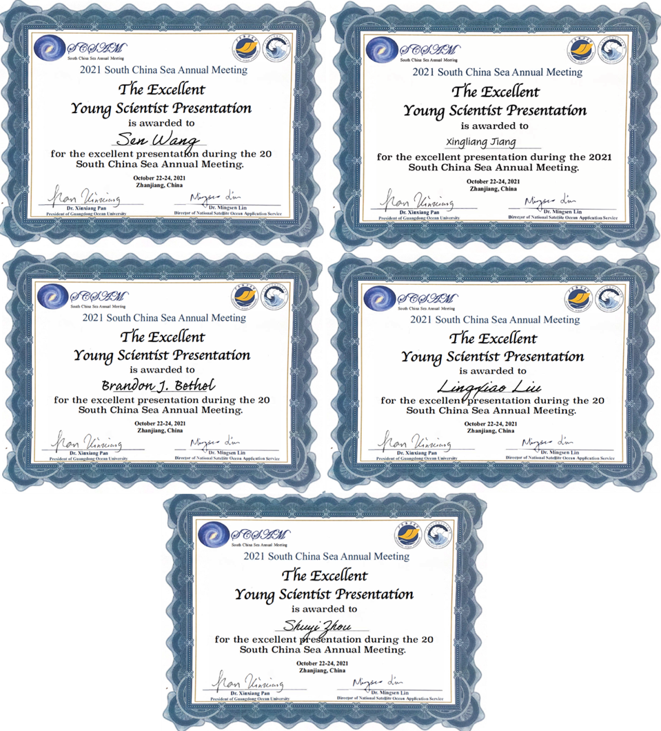 10月22日至10月24日,由广东海洋大学承办的第8届南海年会系列国际会议,即2021年南海年会(2021 South China Sea Annual Meeting Agenda)在广东省湛江市顺利举办。我校海洋科学学院副院长董昌明教授率领其海洋数值模拟与观测实验室的共17名团队成员赴会,并作了专题学术报告和墙报展示。我校王森博士生、蒋星亮博士生、白瑞祥博士生、刘凌霄硕士生和周书逸本科生,在线上学术报告和线下墙报的评选中,表现突出,获得了本次会议的“青年学者优秀报告奖”。