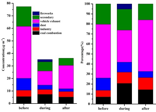 以往我国的一些污染源管控措施多集中在某一城市或某一地区,无法完全反应人为源对空气质量的影响。COVID-19期间,全国多地进行居家隔离,研究团队利用这一时机研究了长三角地区城市化对空气质量的影响。研究发现,在COVID-19期间,长三角不同等级城市大气污染物均有显著降低,PM2.5、PM10、SO2、NO2和CO下降了6.6%~62.4%。城市化对城市群的污染物变化影响很大。在居家隔离期间,大城市(一线和二线)的PM、SO2、NO2和CO的降低幅度要高于中小城市(三线和四线城市),而大城市的O3增加的幅度要明显高于中小城市。研究团队还发现在COVID-19期间气溶胶来源发生较大变化,交通源浓度和占比分别比居家隔离前下降了72.9%和21.7%。在COVID-19期间燃煤源和工业源的占比显著增加,是居家隔离之前的2.9和1.7倍,但是在不同阶段下浓度差异不大。