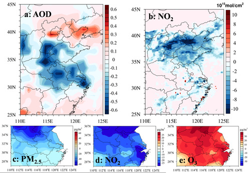 COVID-19期间的居家隔离措施为深入了解人为源和气象条件对我国空气质量的影响机制提供了有利的条件。王红磊副教授团队分别在全国不同气候区-长三角城市群-典型城市三种空间尺度上讨论了COVID-19期间居家隔离措施对我国空气质量的影响。研究团队将中国358个城市分为8个气候区,讨论了不同气候区6种主要污染物的变化特征。研究发现疫情期间,PM2.5在较冷的气候区(如东北(NEC)和西北地区(NW))下降更加明显,下降幅度可达59.0%-64.2%,而在相对比较温度的中南部(CS)和南部沿海(SC)仅分别降低了17.0%和26.0%。O3的变化则正好相反,在长三角(YR)和CS增加的幅度更大,分别增加了99.0%和99.9%,要比西北地区的O3增量高出了20%多。冬季的取暖季,对空气质量的影响也较大。PM2.5、SO2和CO在集中供暖的冷区(NEC、NW、NCP和MG)相比没有集中供暖的地区(YR、CS和SC)的变化幅度更大。气候条件对NO2的影响较小,全国不同气候区NO2的浓度下降了41.2%–57.1%。