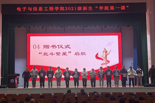 随后,2021级新生代表们传承榜样力量集体发言,他们坚定理想信念,胸怀科技报国之梦,号召在场新生以实际行动去弘扬新时代北斗精神,发扬北斗人不怕苦、不怕累的优良传统,积极践行青春誓言,争当电信“北斗繁星”。学院也进行了赠书仪式,为新生代表发放了《“北斗繁星”新生启航》手册,激发学生成才的内生动力,希望同学们实现自我教育、自我管理、自我服务。