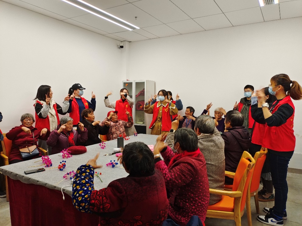 第一组志愿者在室外的花园中由工作人员带领和指导,开展帮扶蔷薇、拔除杂草、打扫卫生等工作,让老人们拥有了更舒适的居住环境。第二组志愿者在室内的活动室中与老人们一起用车轮珠编花束,一起玩击鼓传花,一起表演节目等。最后,两组志愿者和老人们一起学习手指舞,其乐融融,欢笑不断。