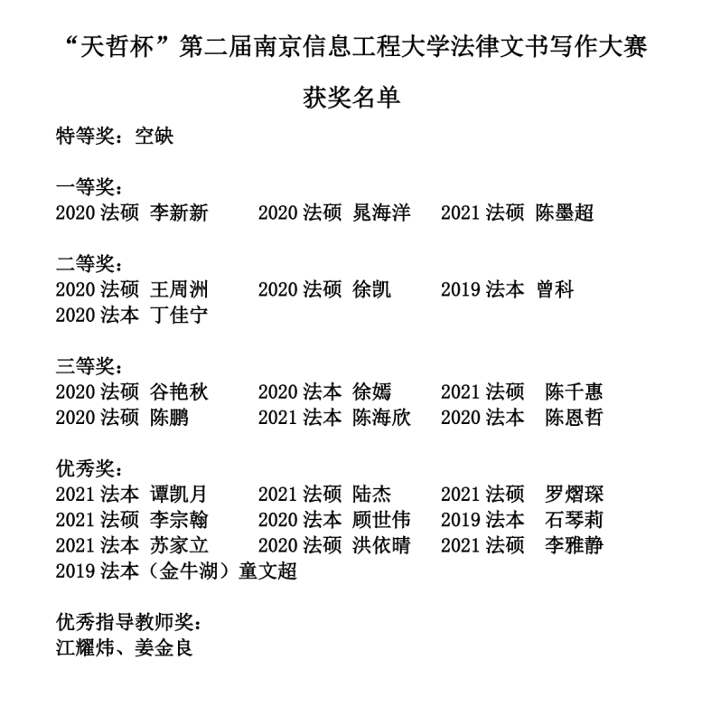 据悉,2021年,南京信息工程大学法政学院和江苏天哲(镇江)律师事务所共同举办了首届“天哲杯”法律文书写作大赛。该赛事自举办以来,一直以培养学生的法律文书写作能力、提升其法律实务执业素养及技能、积极引导学生运用法律专业知识和法律逻辑思维分析和解决法律实务问题为宗旨。本次法律文书大赛提升了我校法科生的法条和案例的检索能力,锻炼了法律文书的写作素养,展现了法政学院学生追求专业、求学严谨的学习态度。