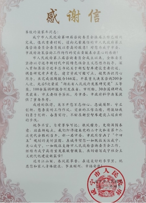 近日,咸宁市人民政府向我校艺术学院院长梁家年教授发来感谢信,对梁家年教授离任“咸宁市人民政府第三届咨询委员会委员致以崇高的敬意”,对“为咸宁市委、市政府决策咨询工作所作的贡献表示衷心的感谢”。