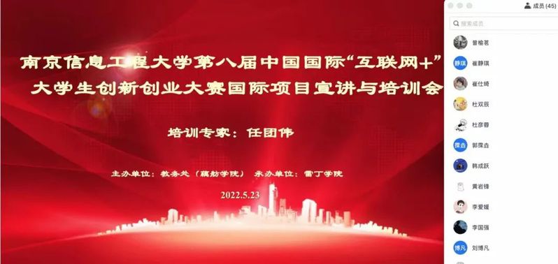 为贯彻落实我校大学生创新创业实践相关文件精神,提升我校学生的创新创业实践水平,教务处(藕舫学院)于5月23日以线上会议模式面向全校学生举办了“南京信息工程大学第八届中国国际“互联网+”大学生创新创业大赛国际项目宣讲与培训会”,宣讲本届“互联网+”大赛国际项目的最新政策和参赛流程,并就撰写商业计划书等相关参赛材料进行了详细指导。本次会议由教务处(藕舫学院)创新创业中心主任任团伟老师担任培训专家,雷丁学院副院长(挂职)王卫主持。