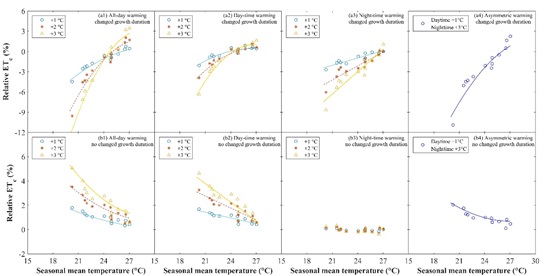 水稻是全球重要的粮食作物,同时也是高耗水作物。水稻水分消耗与生长、生物量和产量等息息相关。水稻生产面临着全球变暖、水资源短缺、生物和非生物胁迫等诸多挑战,其中气候变暖对水稻生产的影响最大。然而观测气候变暖条件下的水稻蒸散量比较困难,因此运用作物模型估算气候变暖情况下水稻的蒸散发成为研究热点。很多研究表明,全球变暖呈不对称增温形式,然而日尺度上的作物模型只能评估全天变暖对作物蒸散发的影响。