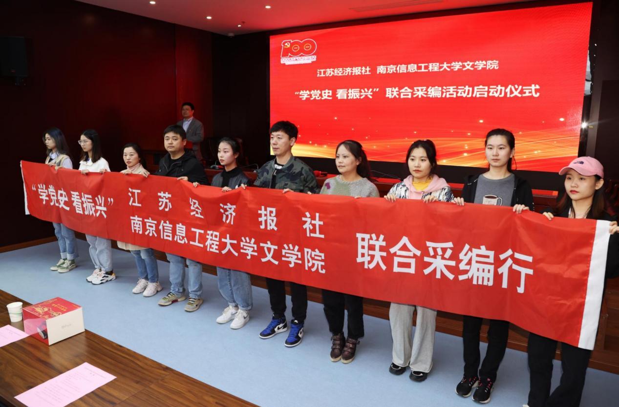 在纪念馆参观后,双方在纪念馆会议室召开党史学习教育启动仪式。仪式上,双方代表启动江苏经济报社-南信大文学院“学党史 看振兴”联合采编活动,江苏经济报社还向南信大文学院赠送建党百年5G+VR党建学习机。自去年12月江苏经济报社与南京信息工程大学文学院合作签约后,双方在人才培养、科学研究和人员交流等方面进行了卓有成效的合作。以此次活动为契机,双方将在党建方面共同探索、共享资源、共谋发展。