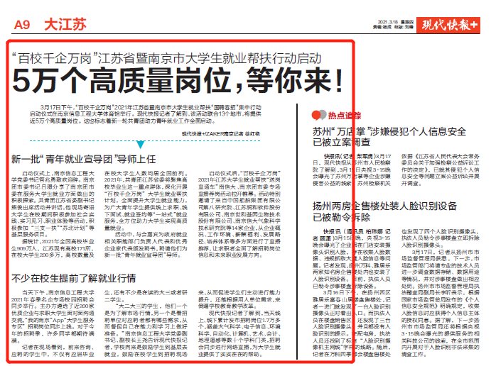 3月17日下午,“百校千企万岗”2021年江苏省暨南京市大学生就业帮扶“国聘春招”集中行动启动仪式在南京信息工程大学体育馆举行。现代快报记者了解到,该活动联合13个地市,将提供近5万个高质量岗位。这也标志着新一轮共青团助力青年就业工作全面启动。