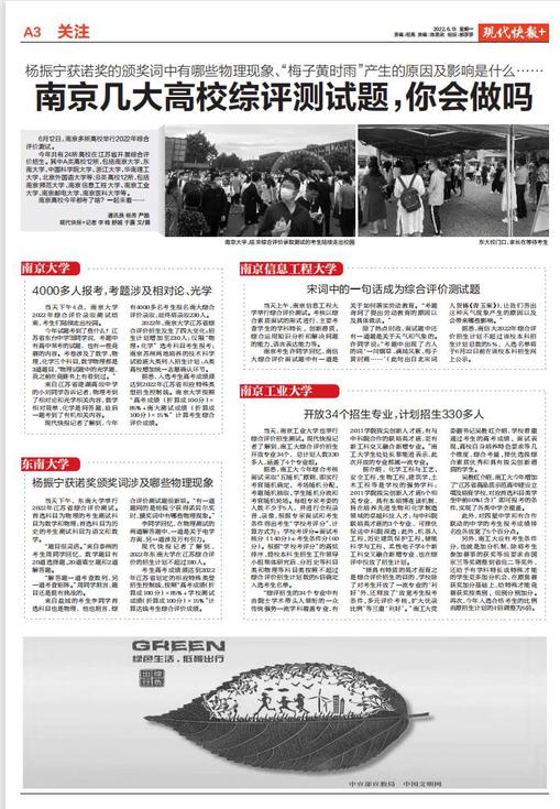 来自盐城的考生李同学首选科目也是物理,他也坦言,综合评价测试题很新颖。“有一道题问的是杨振宁获得诺贝尔奖时,颁奖词中有哪些物理现象。”