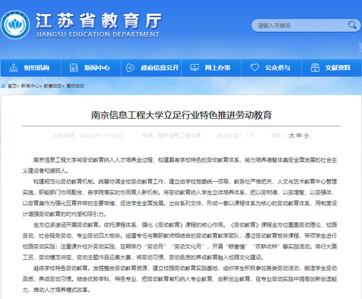 南京信息工程大学将劳动教育纳入人才培养全过程,构建具有学校特色的劳动教育体系,努力培养德智体美劳全面发展的社会主义建设者和接班人。