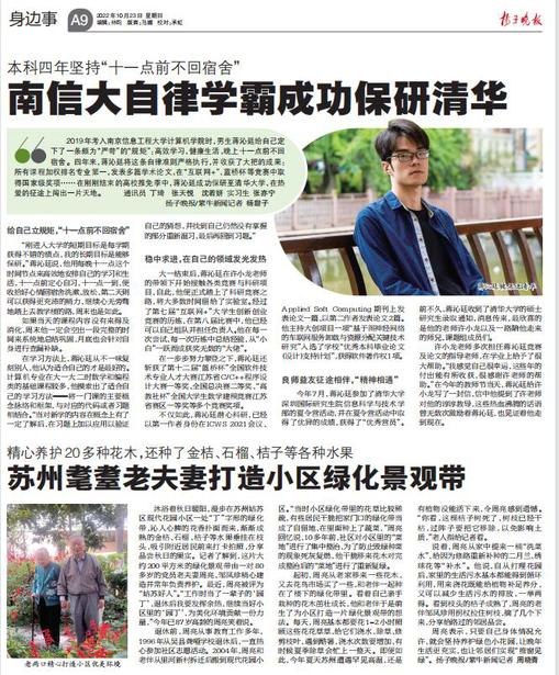 2019年考入南京信息工程大学计算机学院时,男生蒋沁廷给自己定下了一条颇为“严苛”的“规矩”:高效学习,健康生活,晚上十一点前不回宿舍。四年来,蒋沁廷将这条自律准则严格执行,并收获了大把的成果:所有课程加权排名专业第一,发表多篇学术论文,在“互联网+”、蓝桥杯等竞赛中取得国家级奖项……在刚刚结束的高校推免季中,蒋沁廷成功保研至清华大学,在热爱的征途上闯出一片天地。 通讯员 丁琦 张天悦 沈若妍 实习生 张亦宁